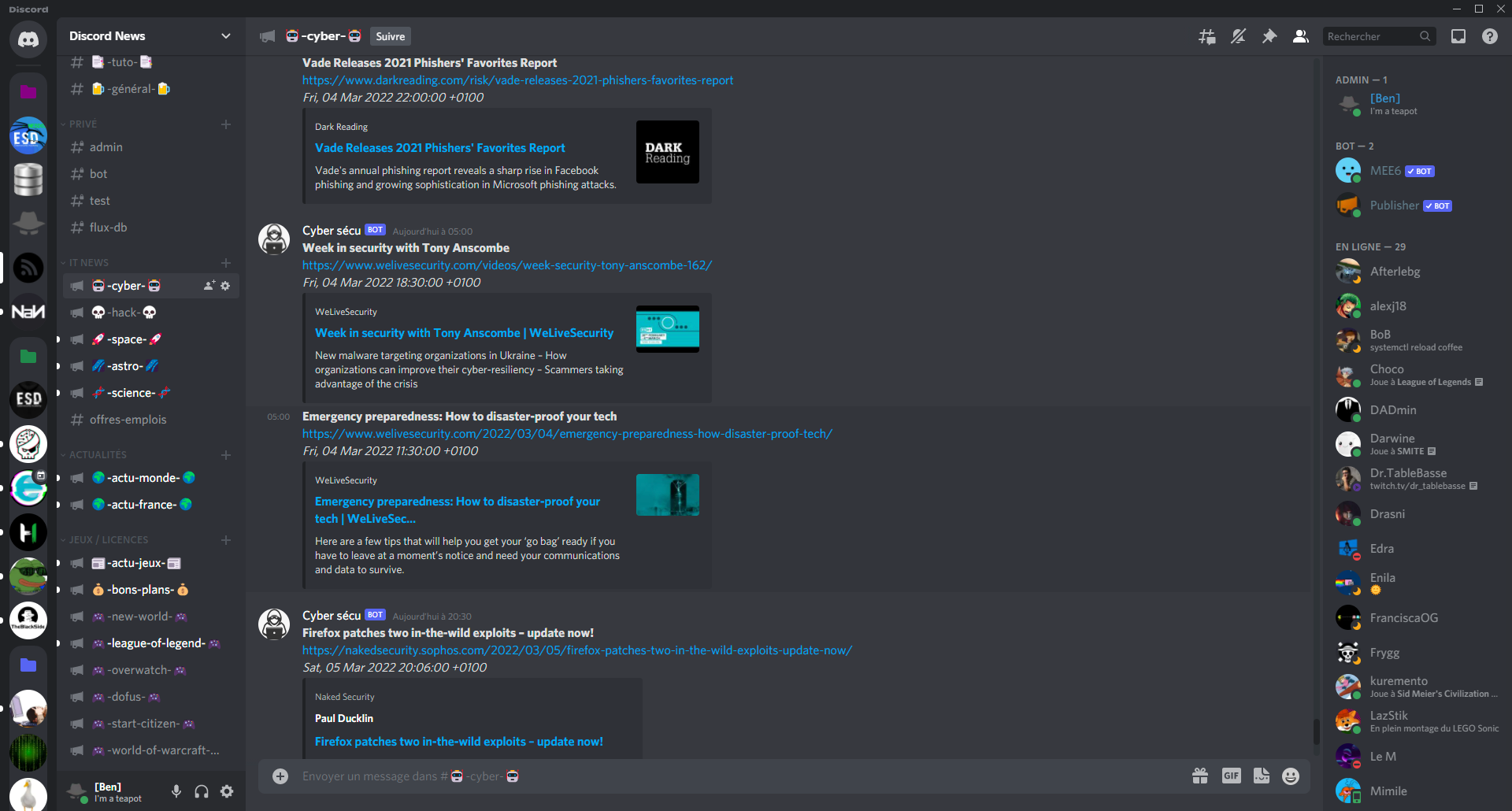 J'ai donc créé un serveur Discord regroupant tous les flux de news en catégories et channels, afin d'en faire profiter tout le monde.