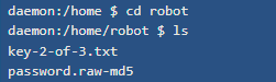 Nous sommes avec l’utilisateur deamon, en fouillant dans la machine on trouve le home de robot